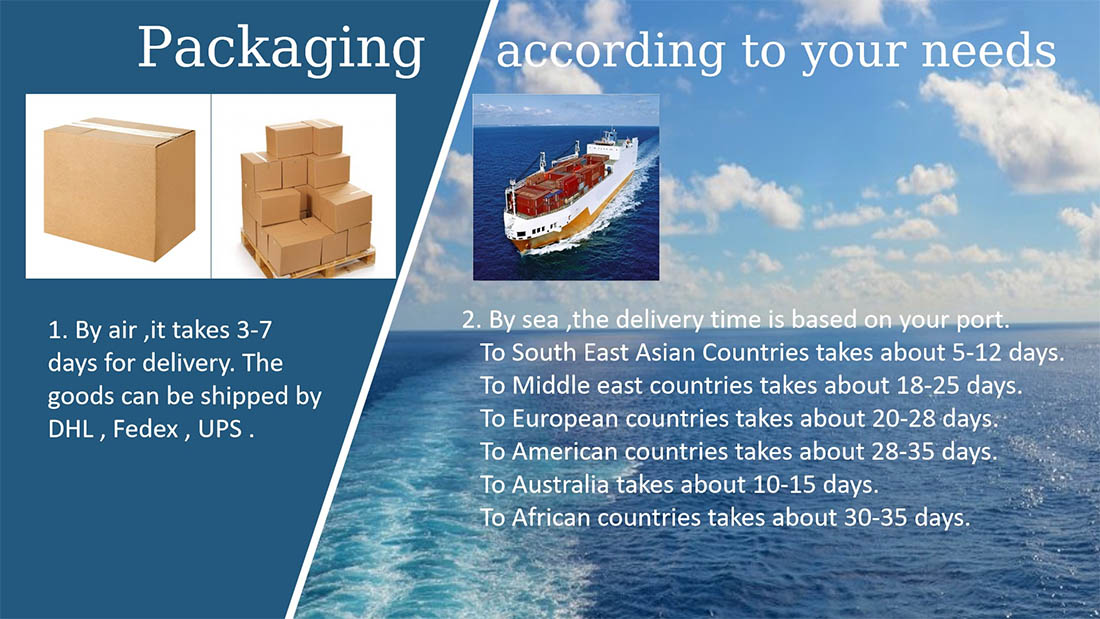 1. Ved luft tager det 3-7 dage til levering. Varerne kan sendes af DHL, FedEx, UPS.
